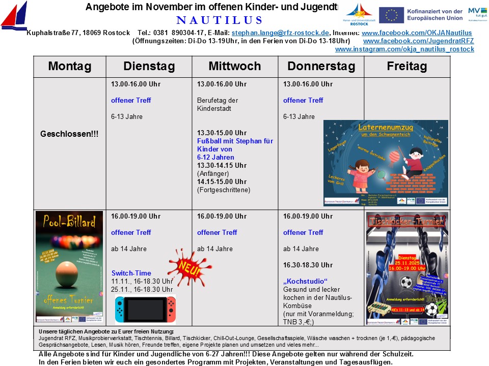 Während Ihr bei einer Tauchfahrt mit Jules Vernes „Nautilus“ die artenreiche Unterwasserwelt unserer Ozeane erforschen könnt, so bietet sich Euch in unserem offenen Kinder- und Jugendtreff „Nautilus“ in Rostock-Reutershagen die Möglichkeit, eine abwechslungsreiche und vielfältige offene Kinder- und Jugendarbeit zu entdecken. Unsere Türen sind für alle Kinder und Jugendlichen im Alter von 6-27 Jahren geöffnet. Kommt vorbei und gestaltet Eure Freizeit individuell nach Euren Wünschen und Vorstellungen. Eigene kreative Ideen, Interessen und Vorstellungen könnt Ihr bei uns aktiv einbringen und mit Unterstützung der Nautilus-Crew eigenständig umsetzen.