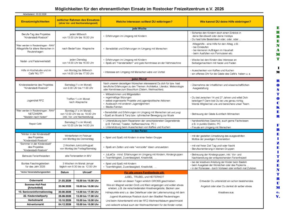 Übersicht über die ehrenamtlichen Einsatzmöglichkeiten im RFZ PDF hier.