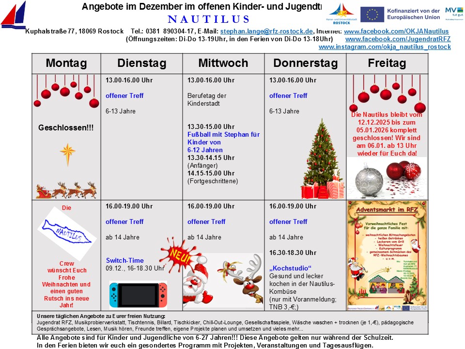 Während Ihr bei einer Tauchfahrt mit Jules Vernes „Nautilus“ die artenreiche Unterwasserwelt unserer Ozeane erforschen könnt, so bietet sich Euch in unserem offenen Kinder- und Jugendtreff „Nautilus“ in Rostock-Reutershagen die Möglichkeit, eine abwechslungsreiche und vielfältige offene Kinder- und Jugendarbeit zu entdecken. Unsere Türen sind für alle Kinder und Jugendlichen im Alter von 6-27 Jahren geöffnet. Kommt vorbei und gestaltet Eure Freizeit individuell nach Euren Wünschen und Vorstellungen. Eigene kreative Ideen, Interessen und Vorstellungen könnt Ihr bei uns aktiv einbringen und mit Unterstützung der Nautilus-Crew eigenständig umsetzen.