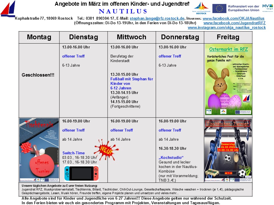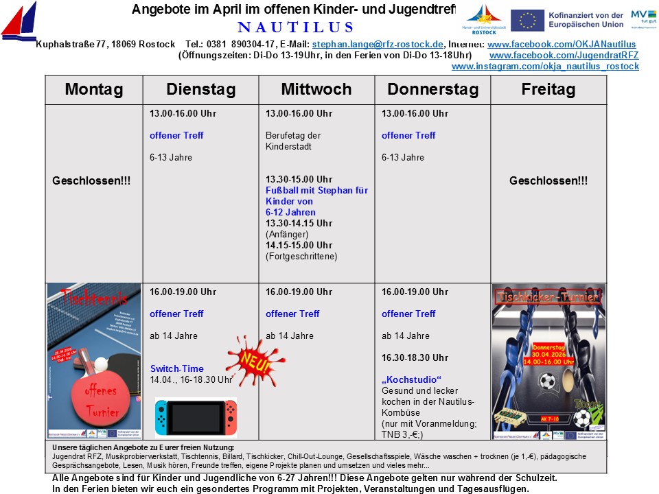 Während Ihr bei einer Tauchfahrt mit Jules Vernes „Nautilus“ die artenreiche Unterwasserwelt unserer Ozeane erforschen könnt, so bietet sich Euch in unserem offenen Kinder- und Jugendtreff „Nautilus“ in Rostock-Reutershagen die Möglichkeit, eine abwechslungsreiche und vielfältige offene Kinder- und Jugendarbeit zu entdecken. Unsere Türen sind für alle Kinder und Jugendlichen im Alter von 6-27 Jahren geöffnet. Kommt vorbei und gestaltet Eure Freizeit individuell nach Euren Wünschen und Vorstellungen. Eigene kreative Ideen, Interessen und Vorstellungen könnt Ihr bei uns aktiv einbringen und mit Unterstützung der Nautilus-Crew eigenständig umsetzen.